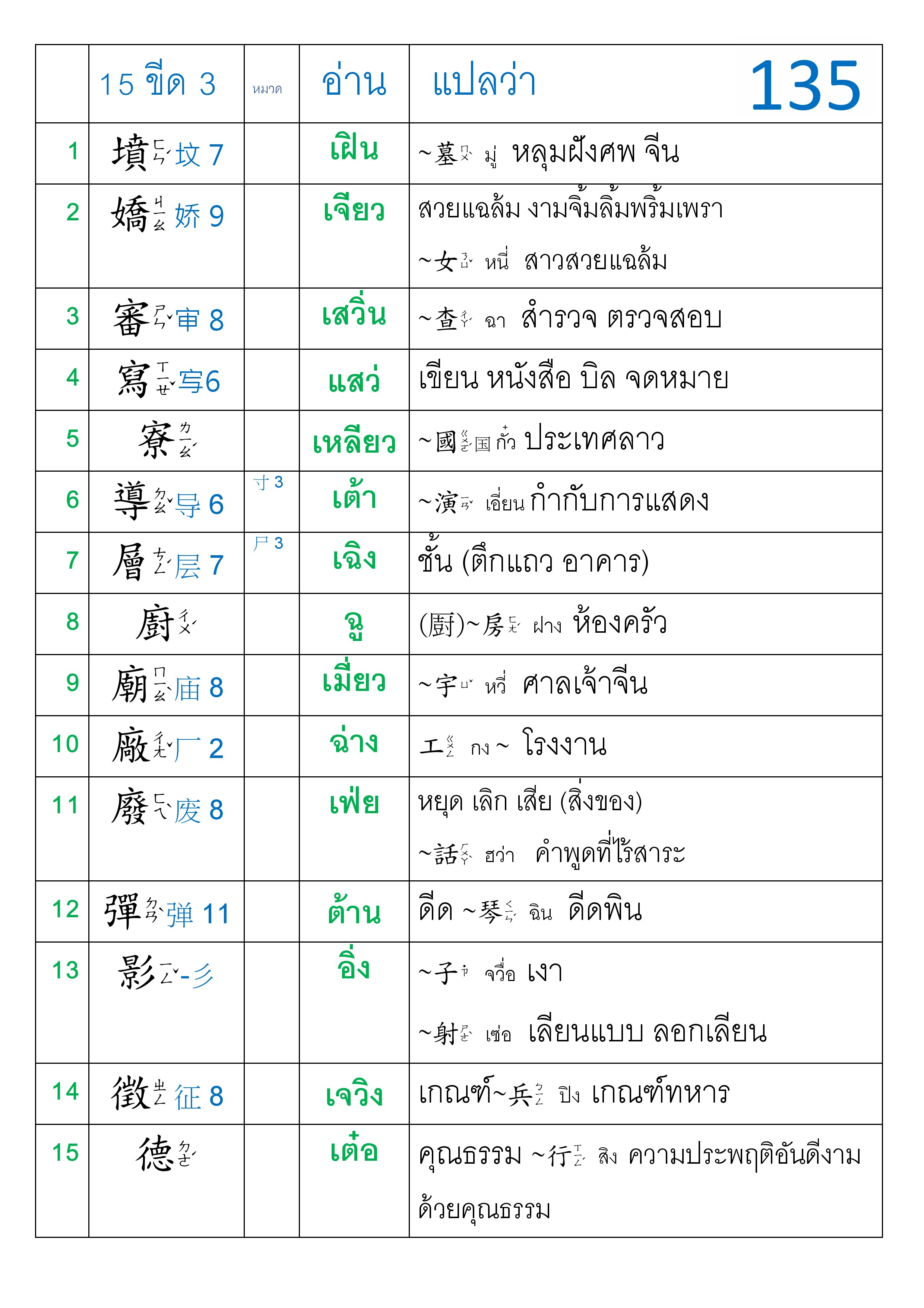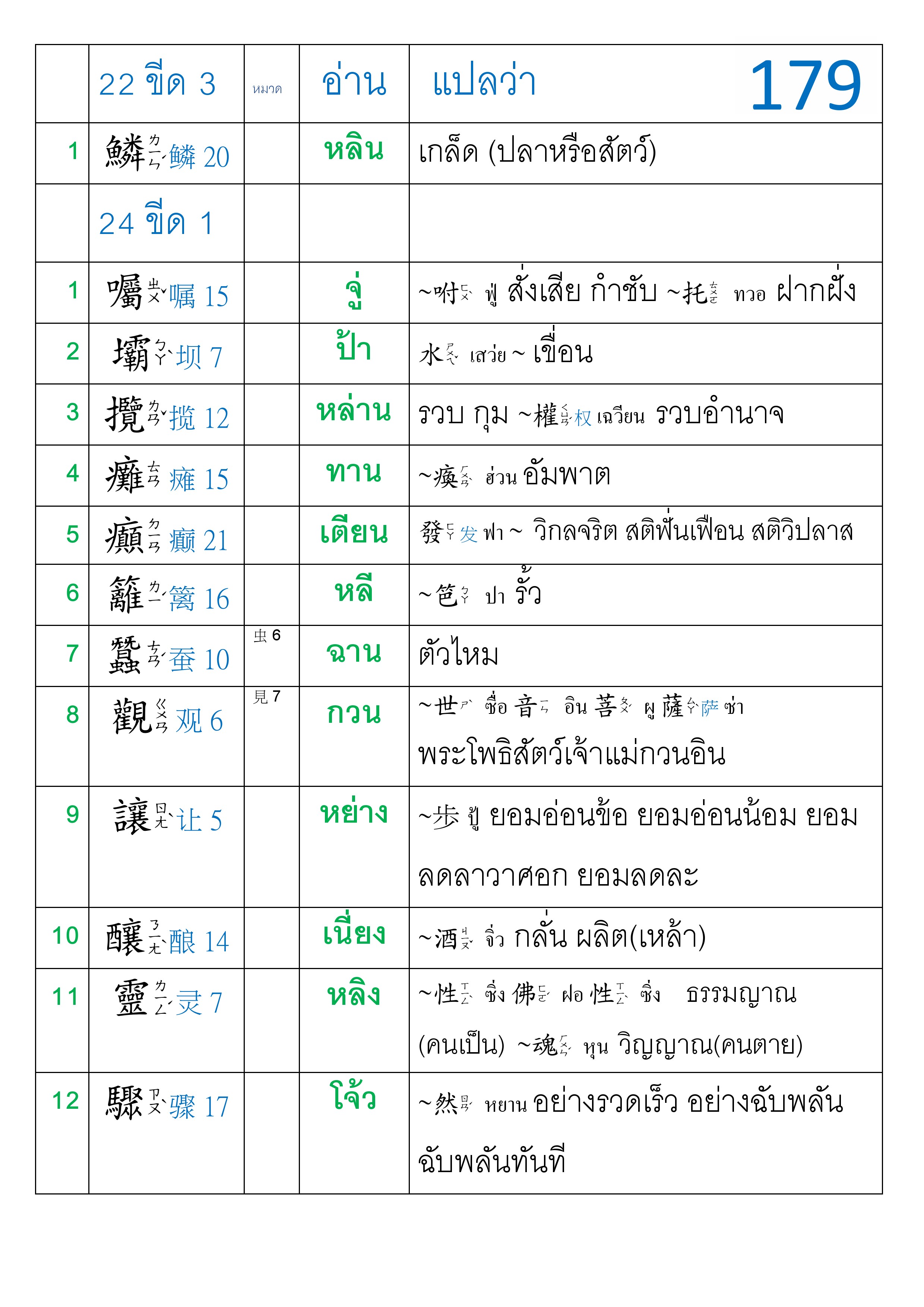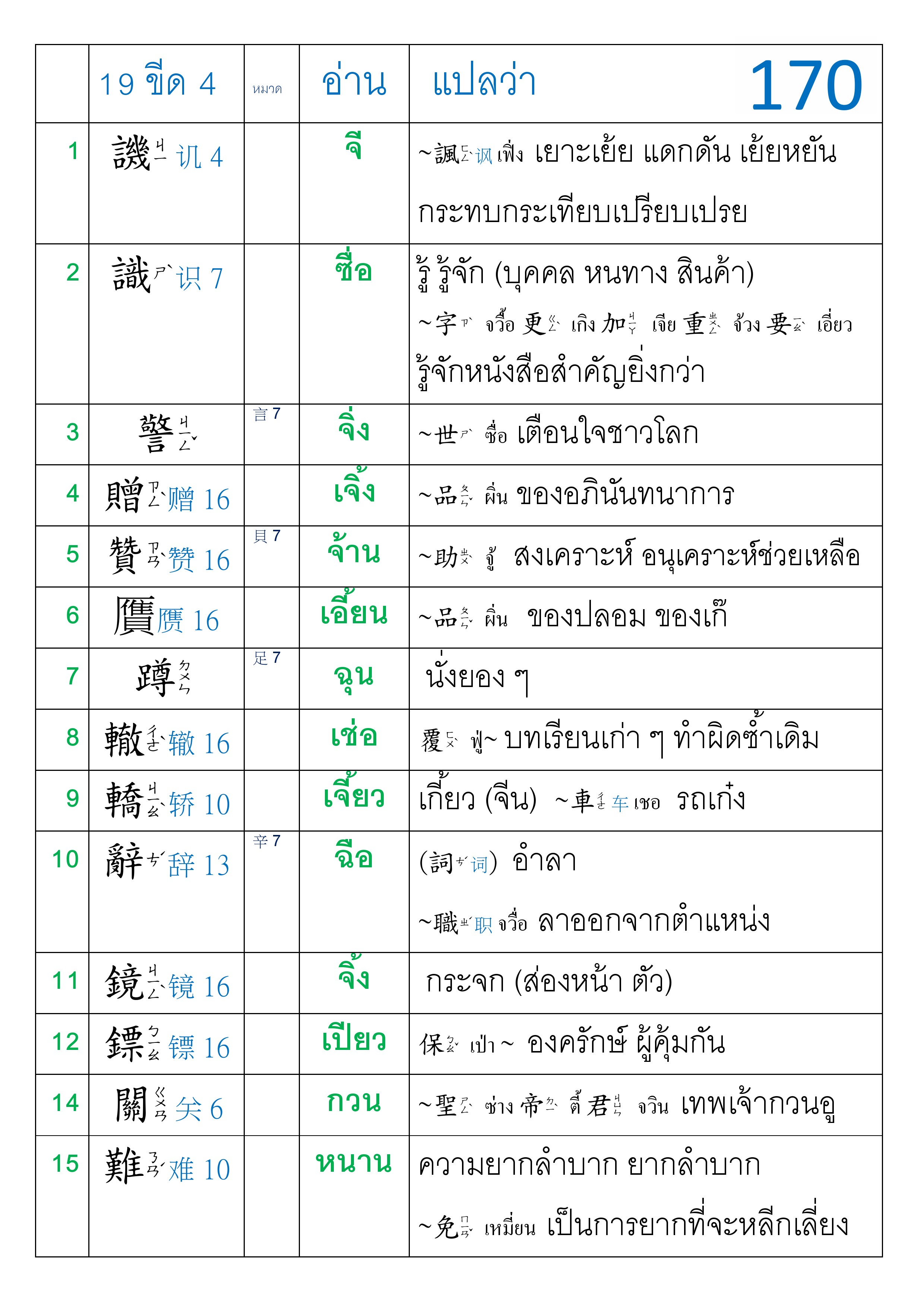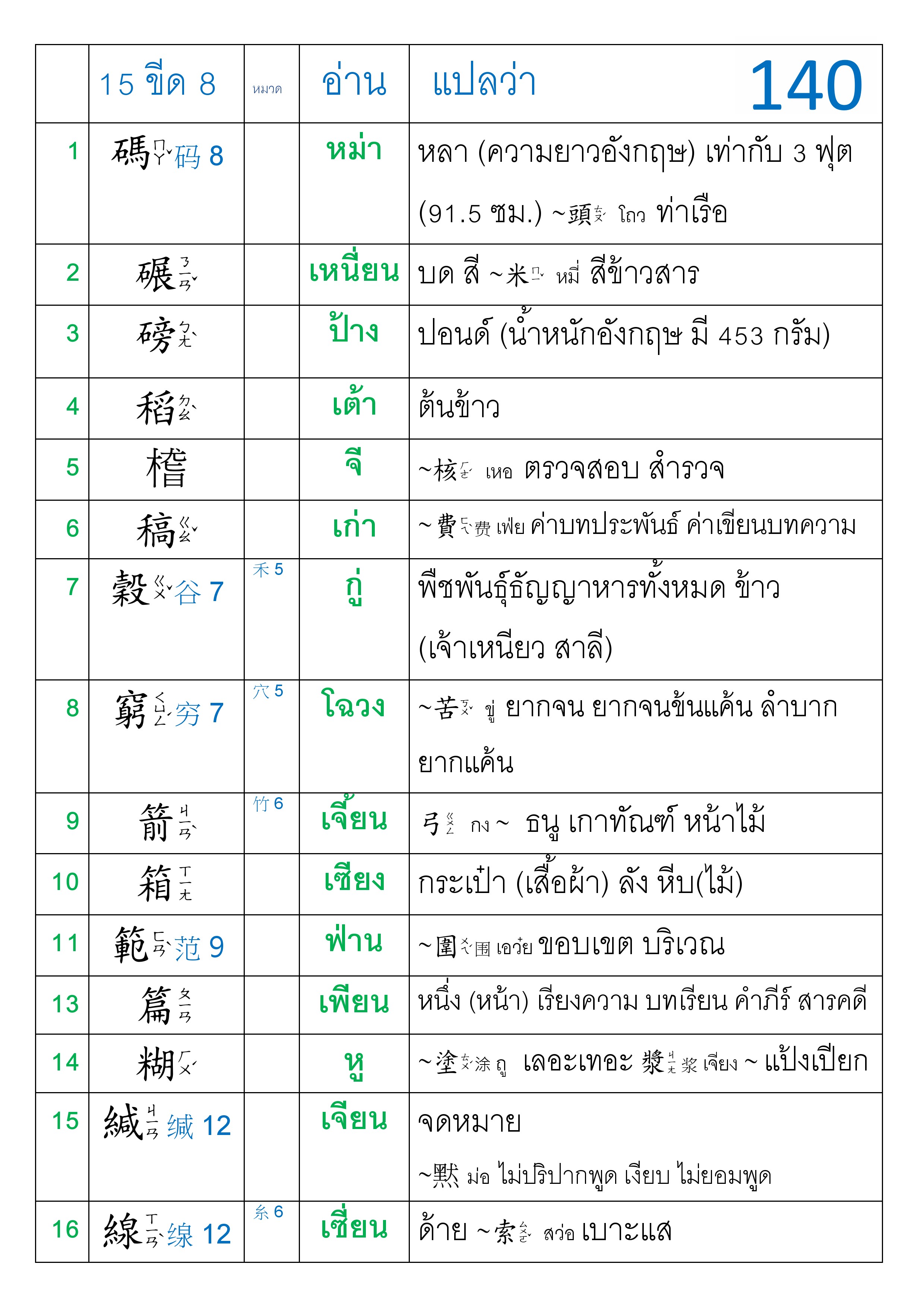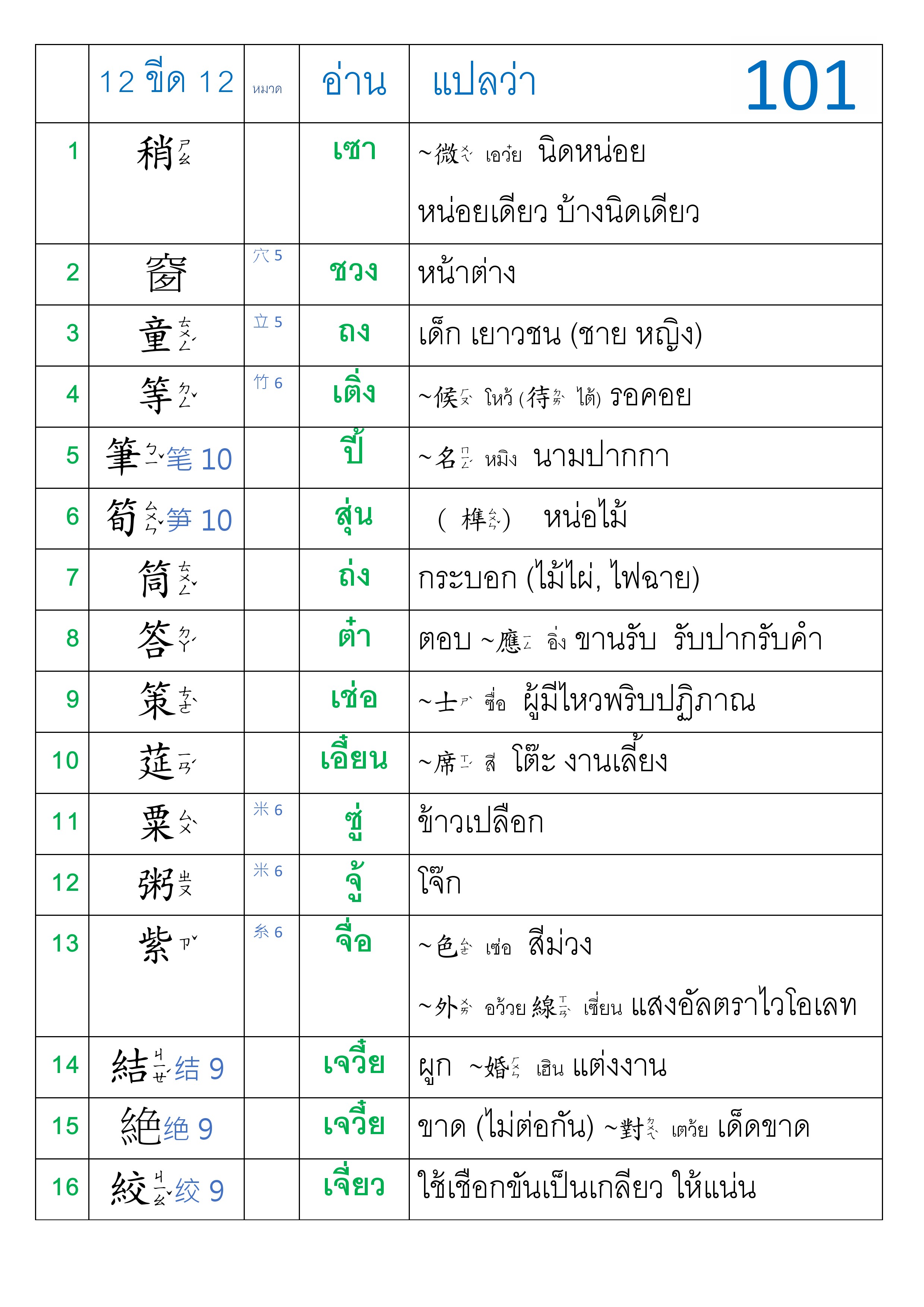 อักษรจีนเต็ม / คำย่อ - จำนวนขีด พร้อม จู้อิน |