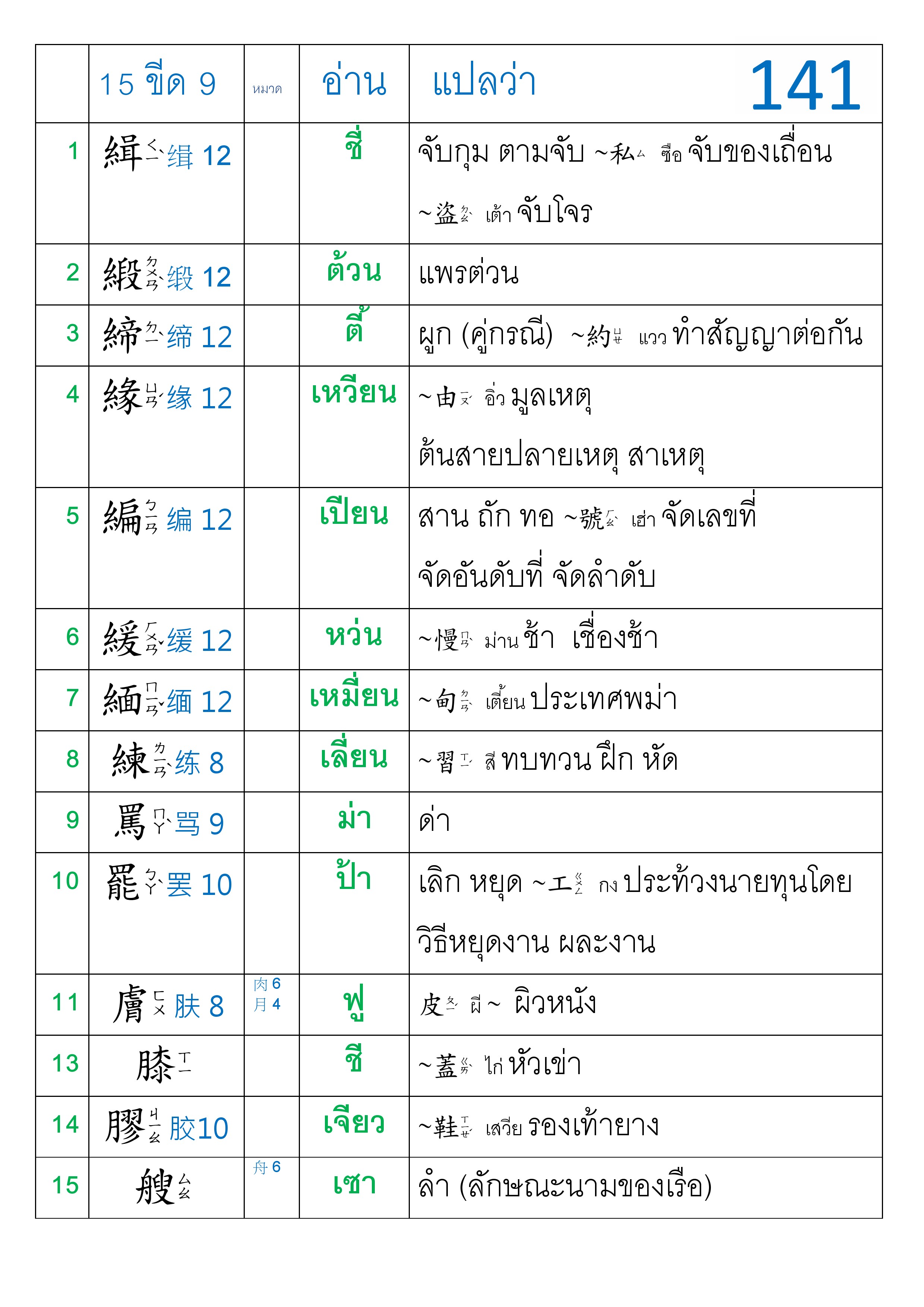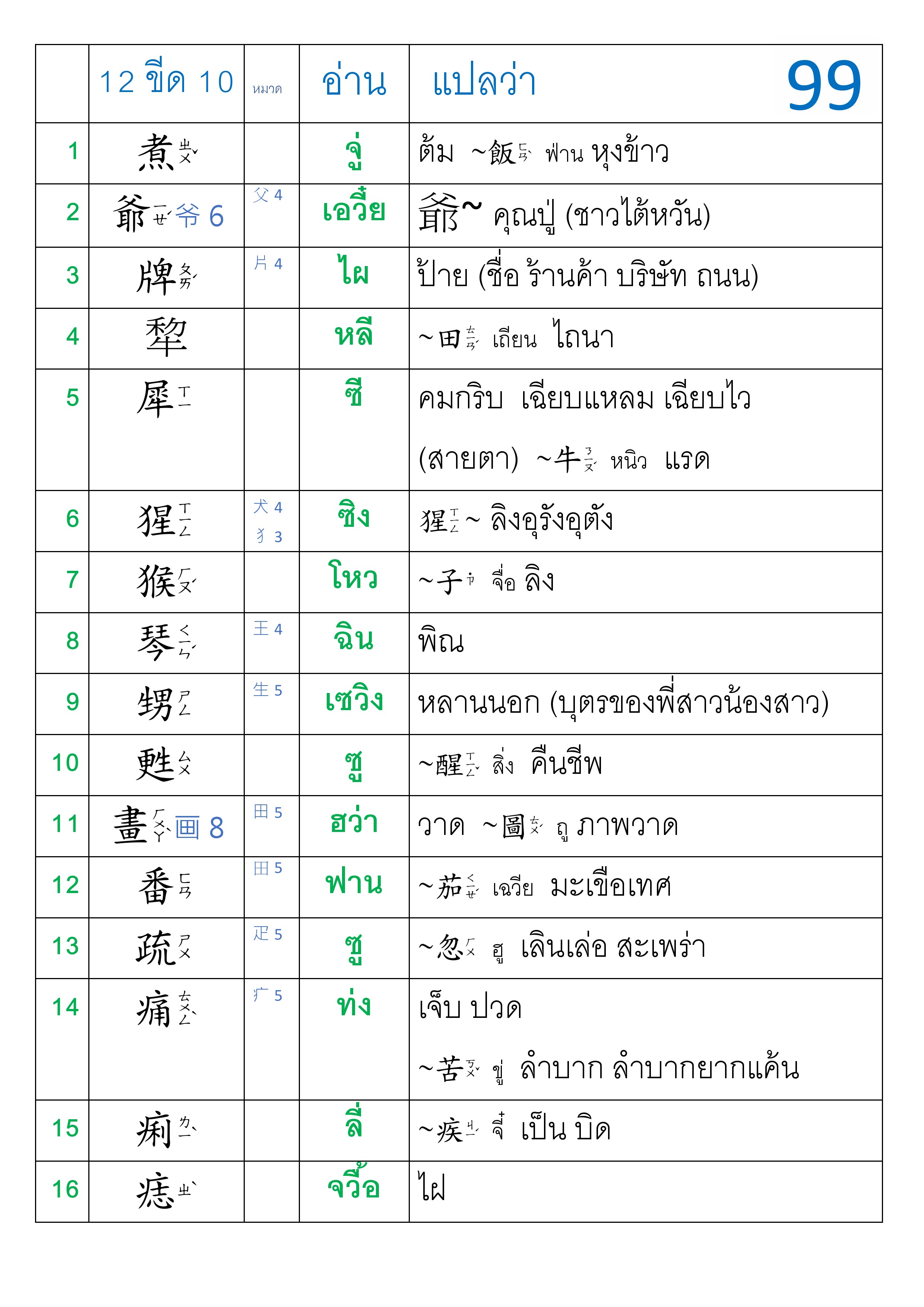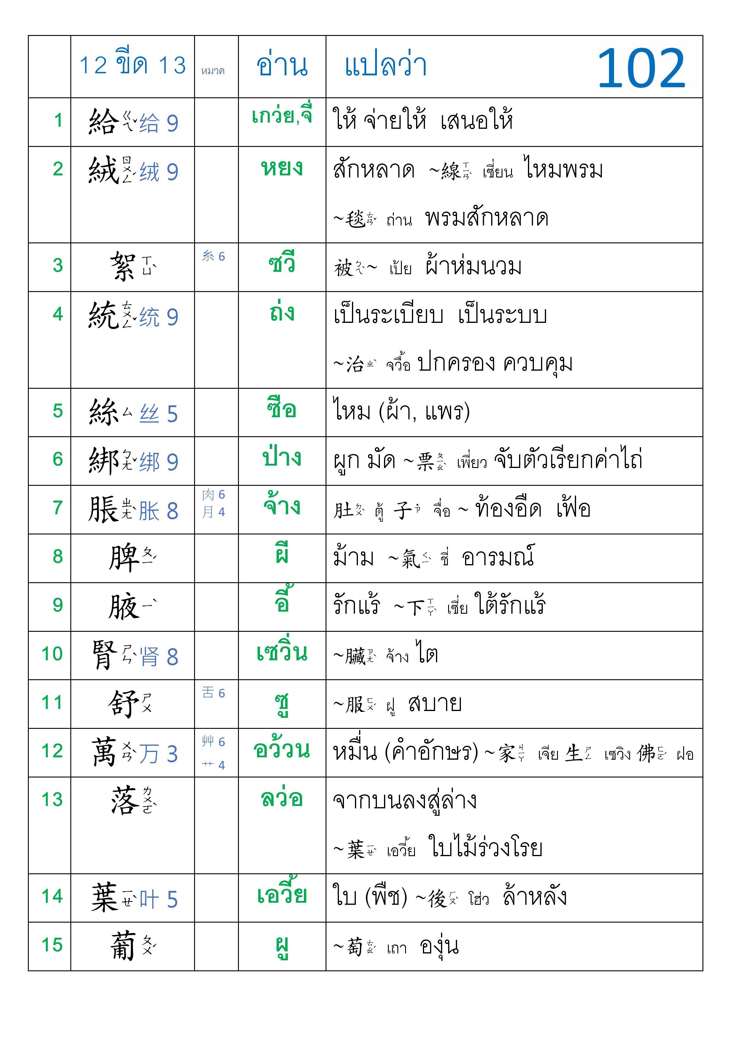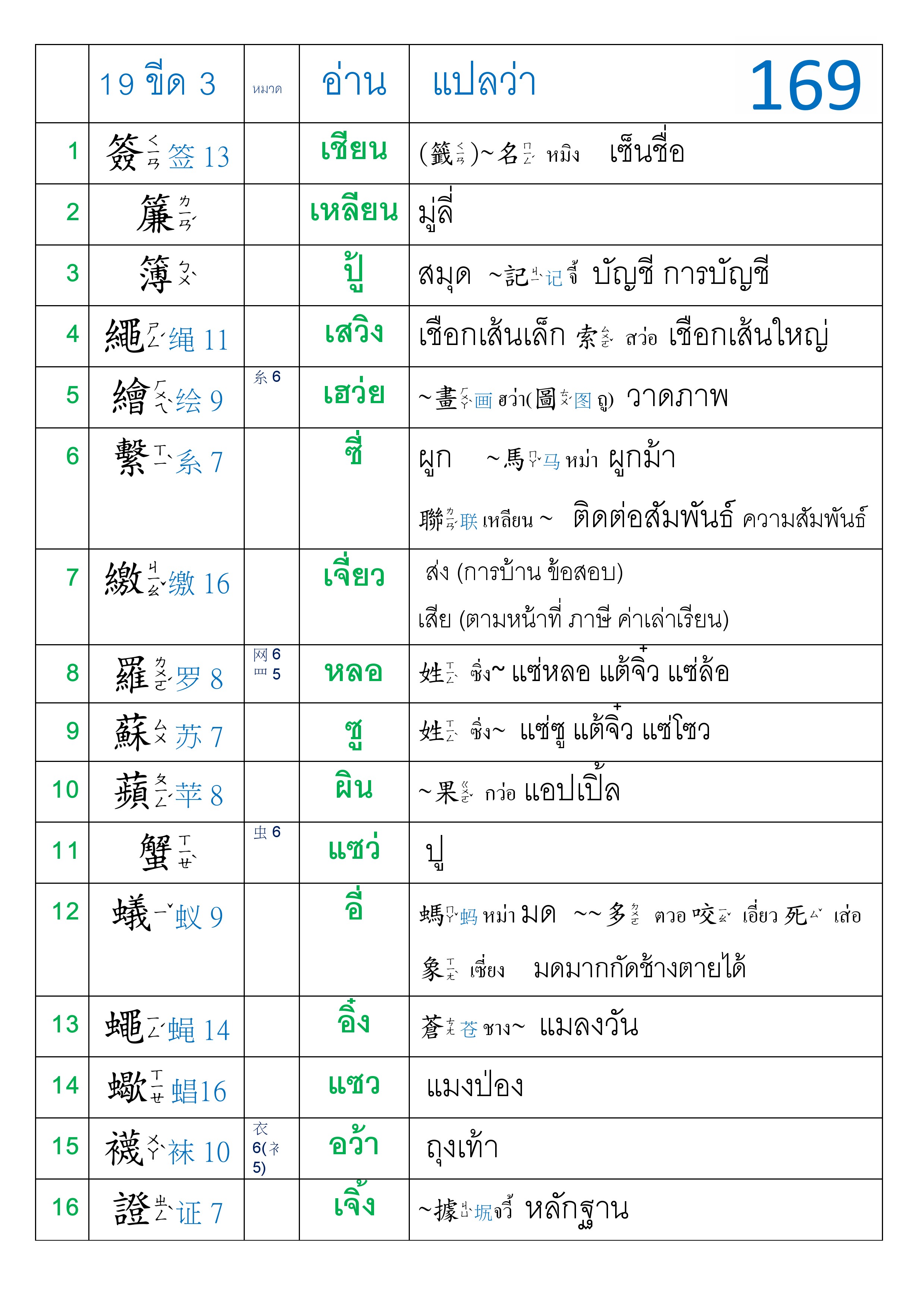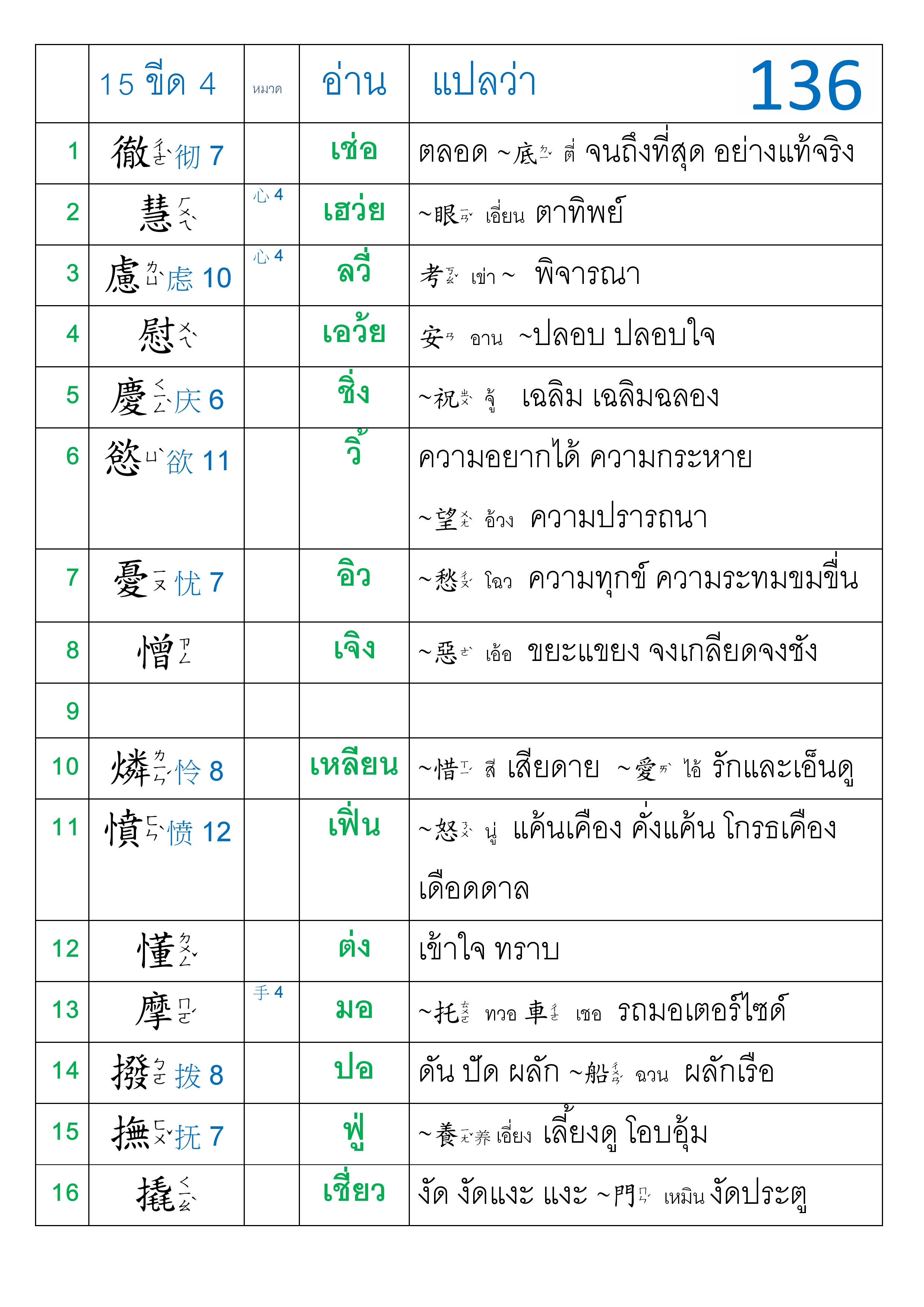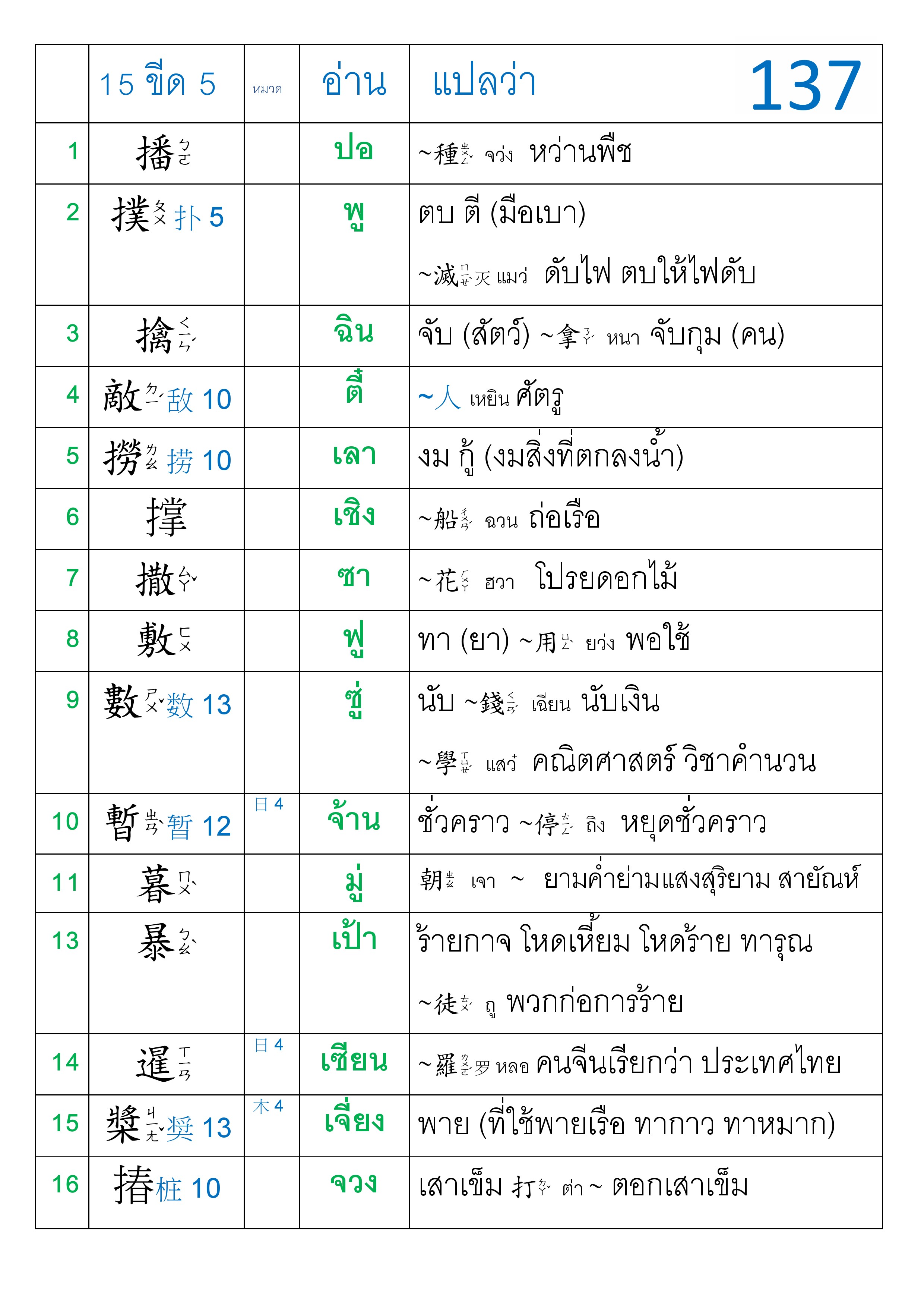 อักษรจีนเต็ม / คำย่อ - จำนวนขีด พร้อม จู้อิน |