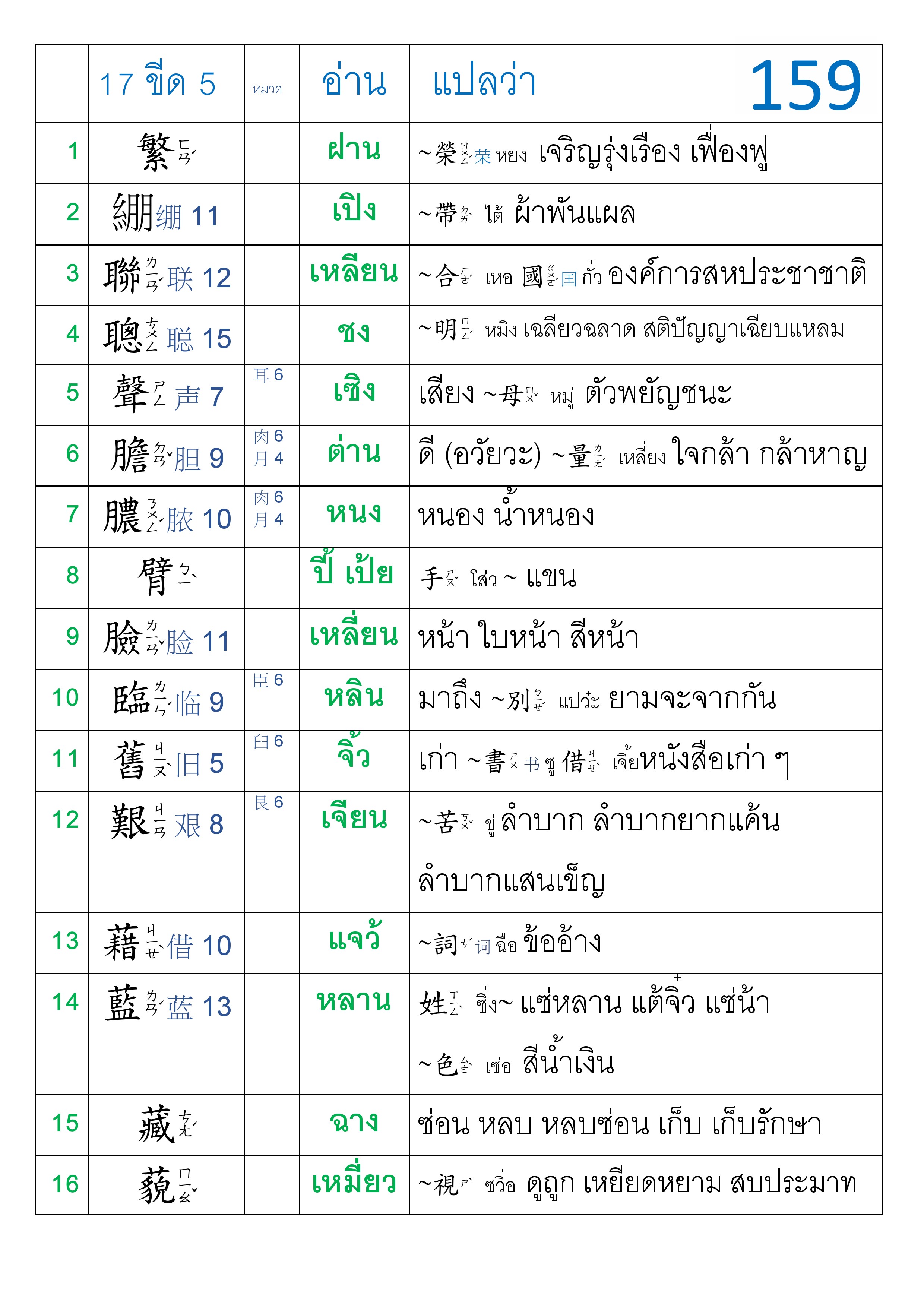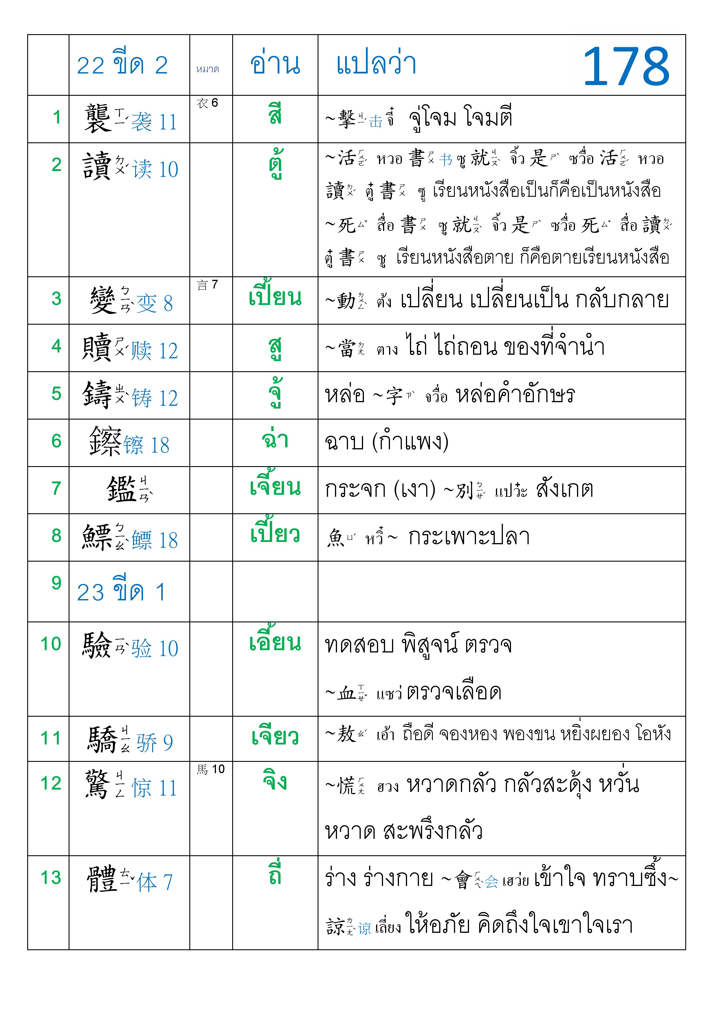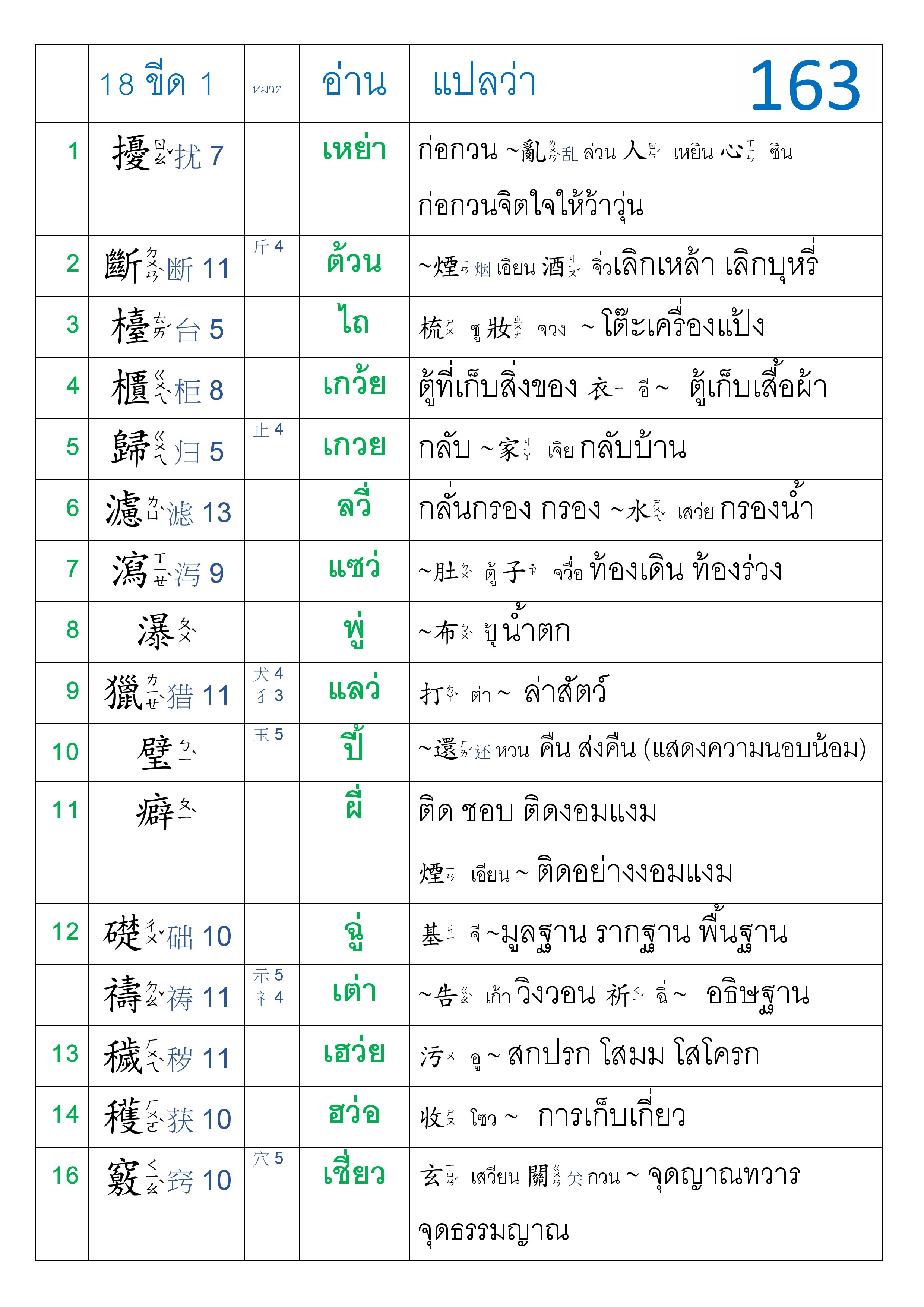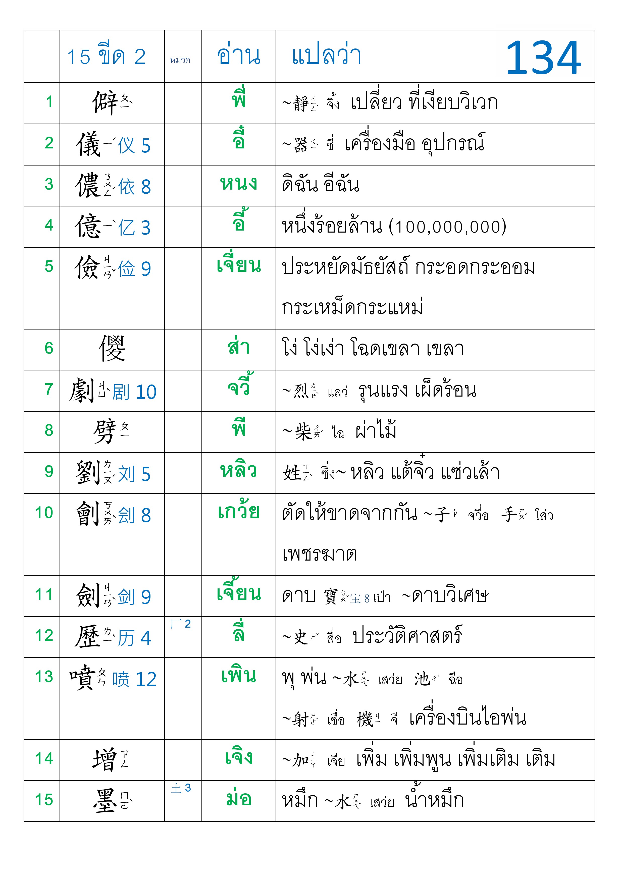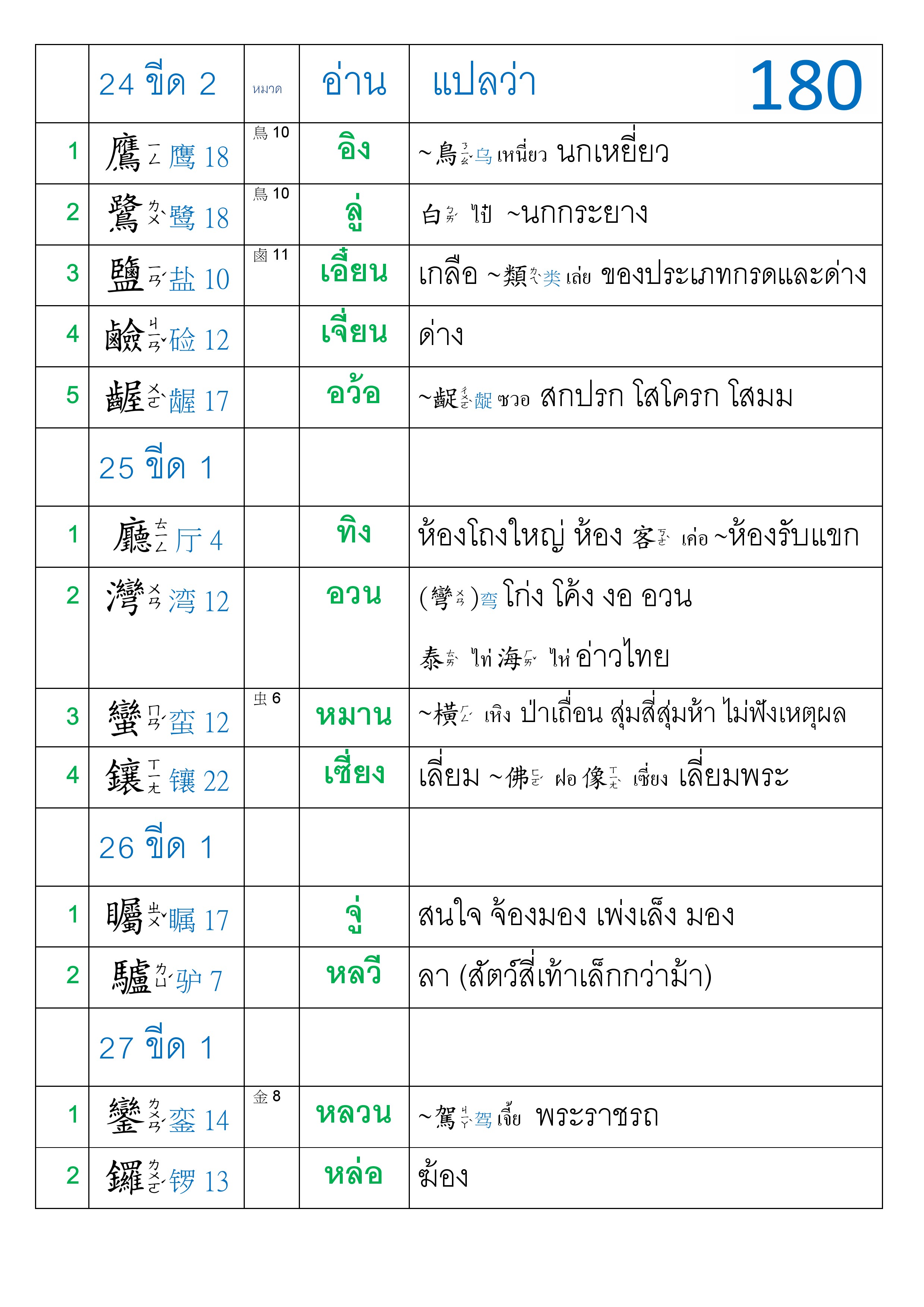 อักษรจีนเต็ม / คำย่อ - จำนวนขีด พร้อม จู้อิน |