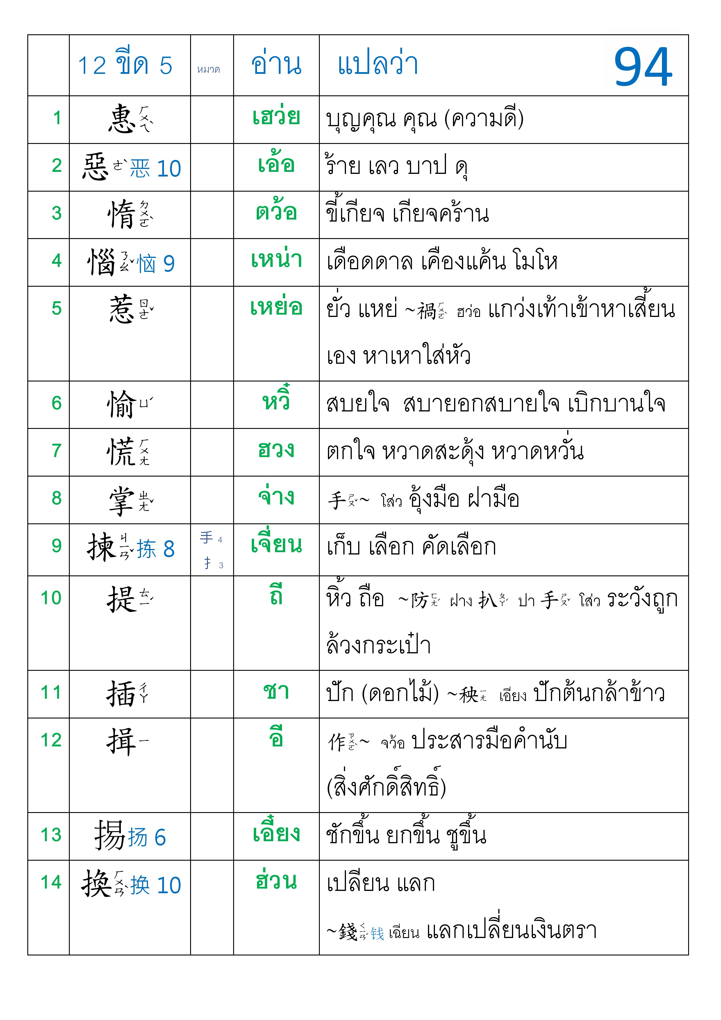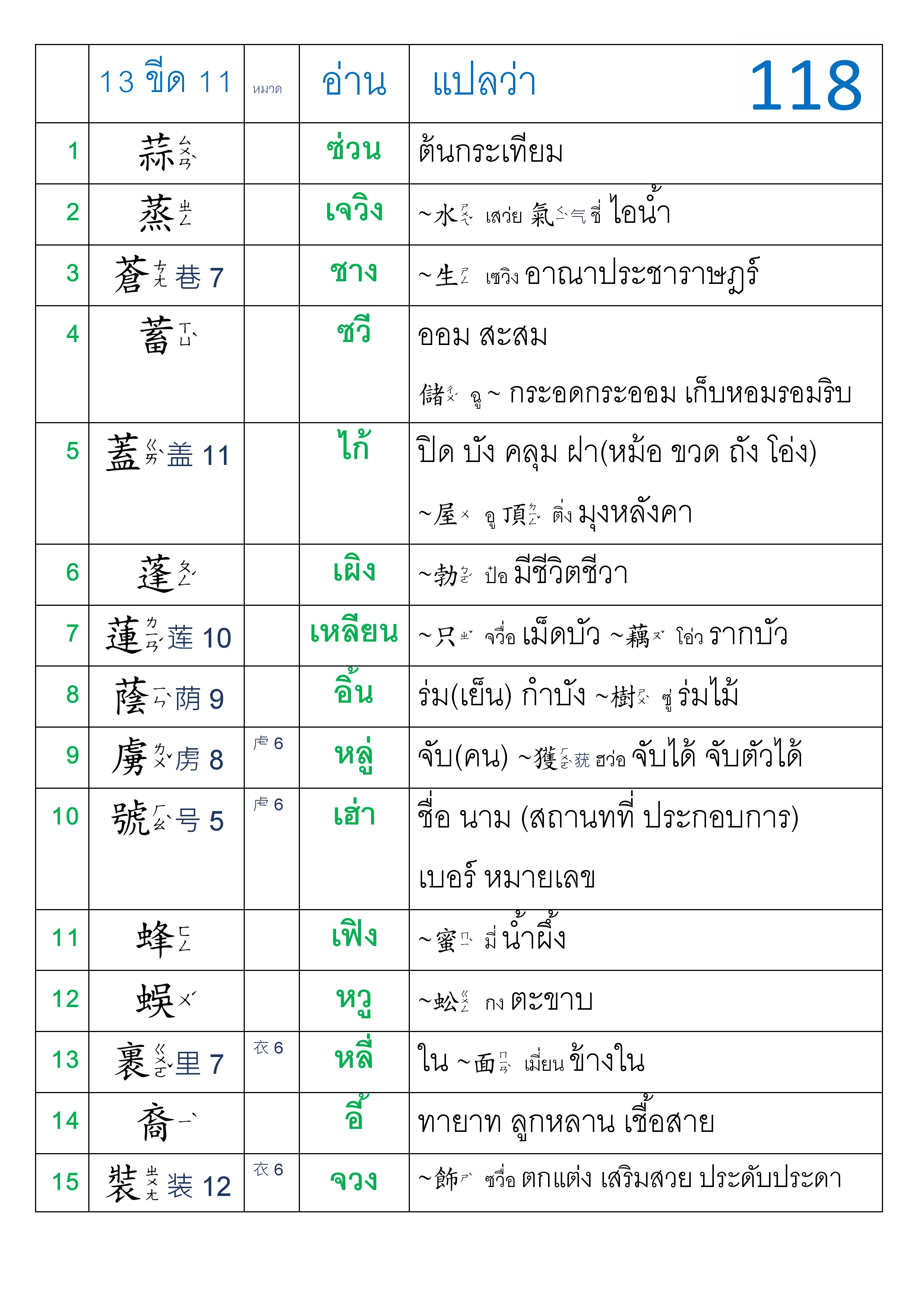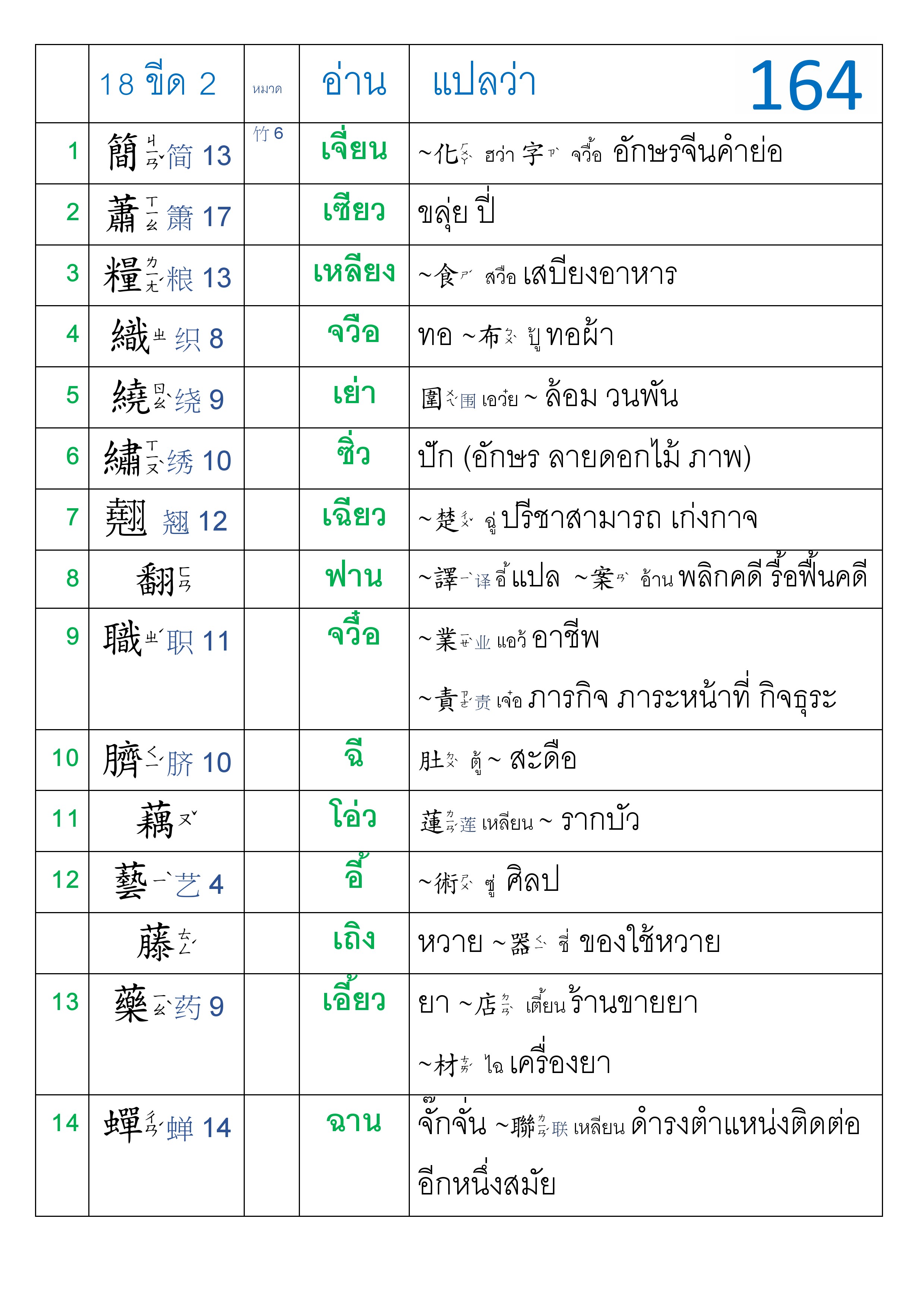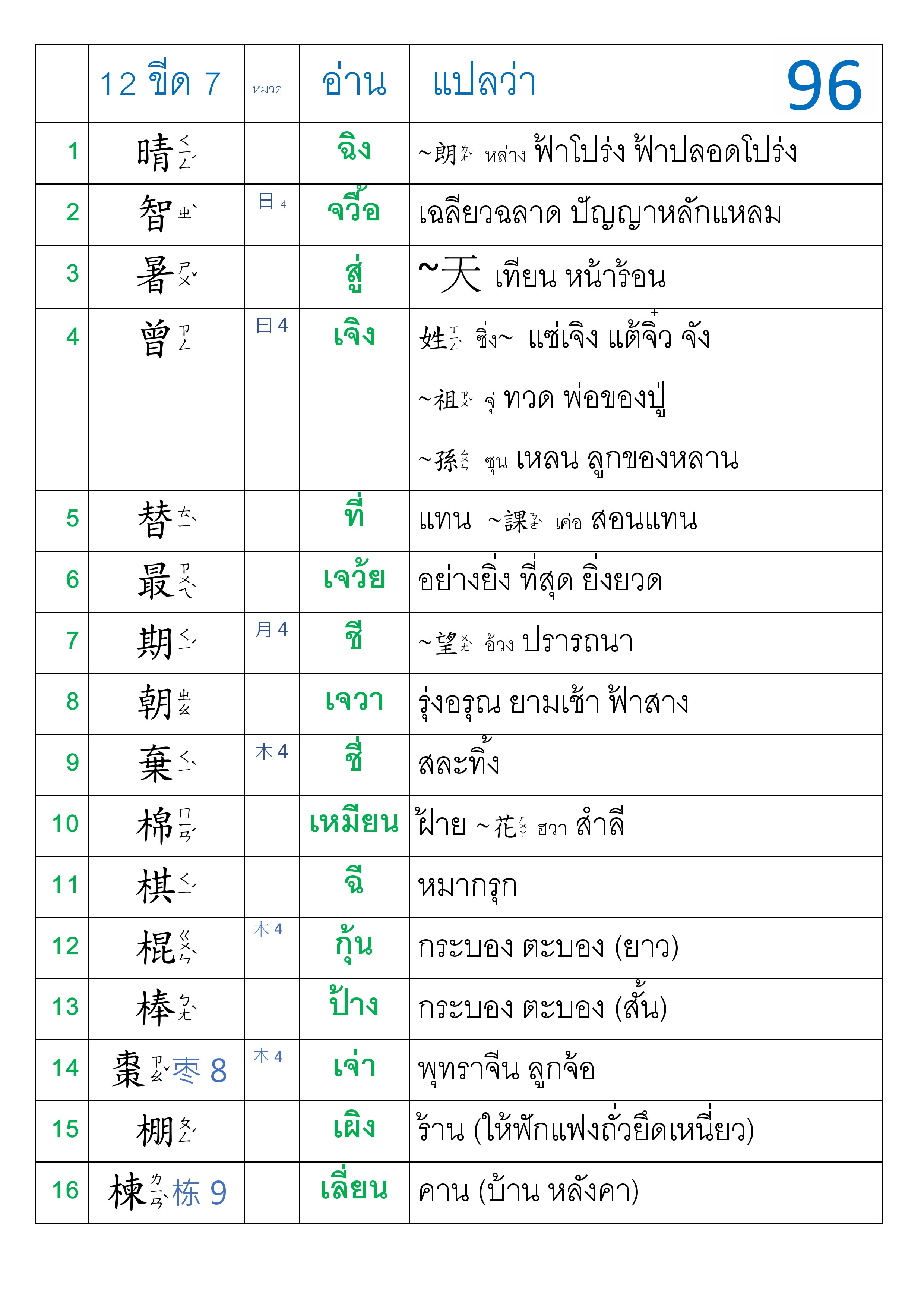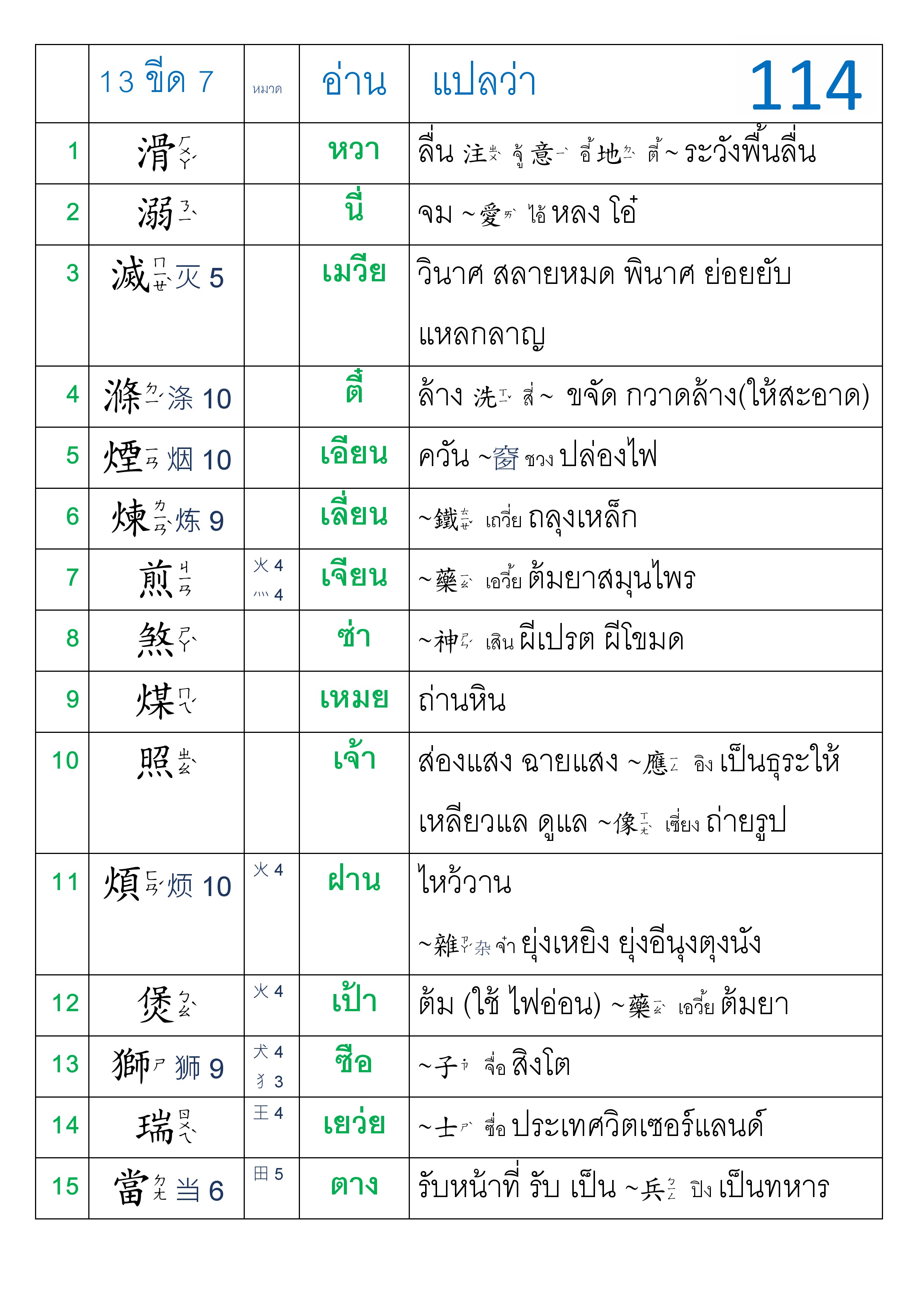 อักษรจีนเต็ม / คำย่อ - จำนวนขีด พร้อม จู้อิน |